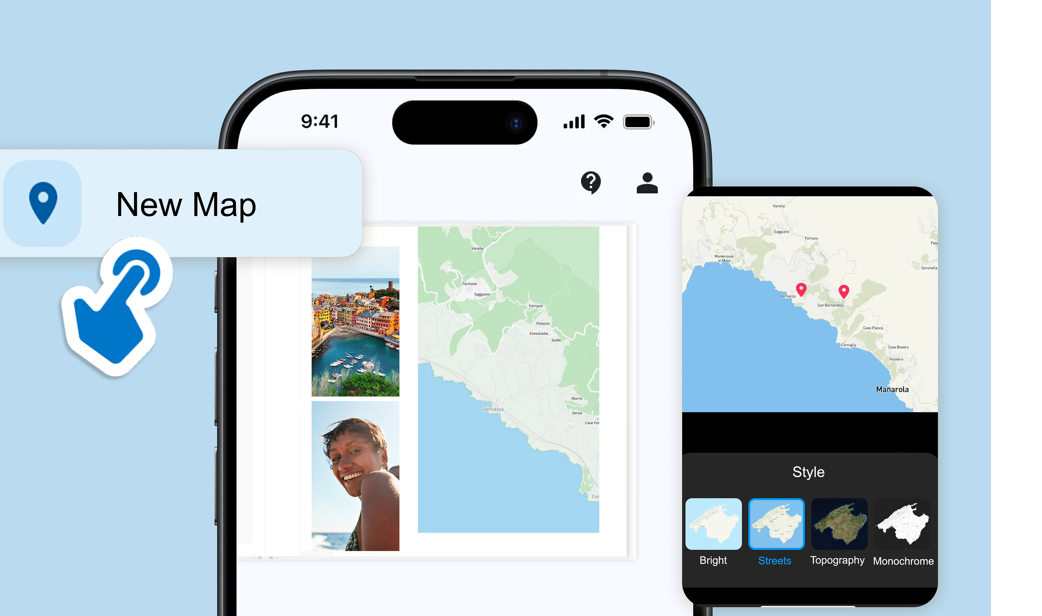 Po prostu dodaj mapę z trasą i wszystkimi miejscami docelowymi bezpośrednio do swojej fotoksiążki Pixum. Zaprojektuj mapę kreatywnie, używając stylów tekstu i clipartów – dokładnie tak, jak lubisz.
